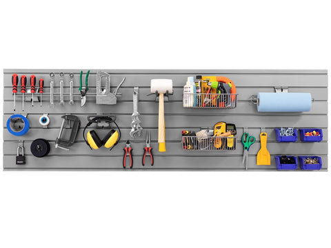 Create an organized and tidy garage space with accessible hooks and baskets designed for use on NewAge Products PVC Slatwall, and compatible with most 3 in. on-center slatwall systems. The NewAge Products PVC Slatwall 20-Piece Accessory Kit includes an array of snap-in components for holding all of your outdoor gear, from hooks capable of storing heavy tools, to Mini Baskets for storing all of your odds and ends. The Paper Towel Holder let’s you tear sheets one-handed for quick tidying, and the Magnetic Toolbar is a great place to store your often-used hand tools, with the magnetic strength to hold pliers, clamps and screw drivers. Built with steel for extra strength, and a powder-coat silver gloss finish that looks great in any space, the PVC Slatwall 20-Piece Accessory Kit helps to keep your garage efficiently organized.