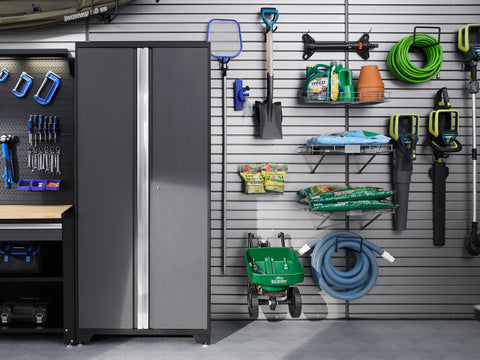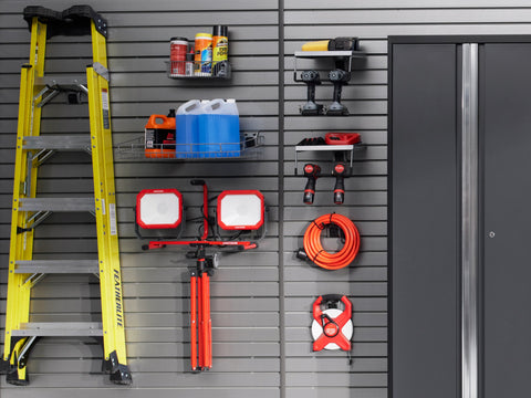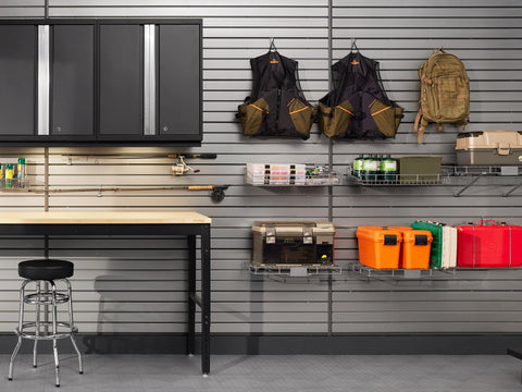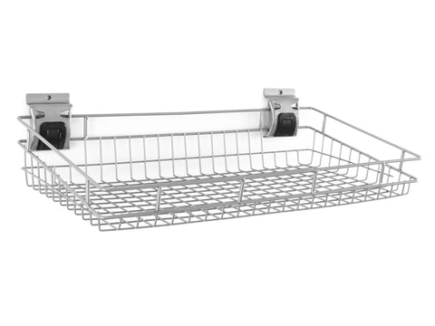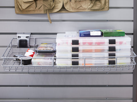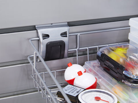 Maximize your slatwall system with NewAge Products Slatwall Accessories. Designed for use with NewAge Products Steel and PVC Slatwall systems, and compatible with most 3 in. on-center slatwall systems, our snap-in Slatwall Accessories are built with steel for extra strength. The powder-coat silver gloss finish looks great in any space and on both silver and black slatwall solutions. Shallow Basket, equipped with a locking mechanism, is designed to safeguard your belongings. It features a lip to prevent items from slipping off, the Shallow Basket is ideal for storing cleaning supplies, paint cans, and gardening pots.