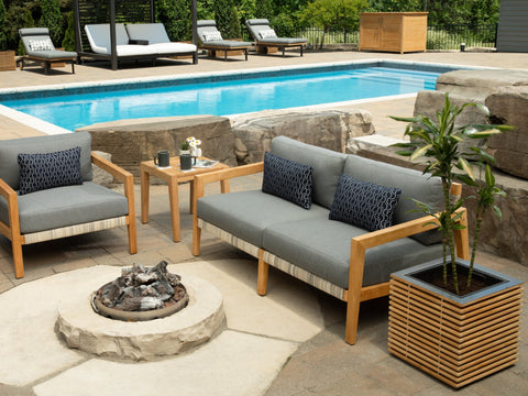 The Monterey sofas can be paired with a coffee table, side table, ottoman, and umbrellas.