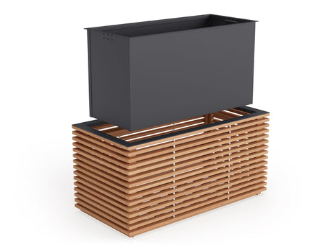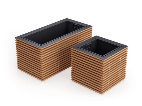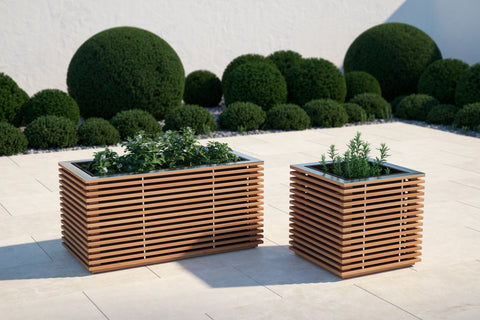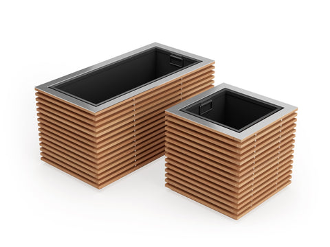 Dress up your backyard oasis with accents of natural greenery in sophisticated Monterey Collection planters. Available in square or rectangular designs, the full slatted exterior casing is crafted of premium natural teak for years of weather-resistant beauty. Elegant top accent pieces in stainless steel or powder coated aluminum coordinate with seating materials. Our versatile planters can also be used as ice buckets. Simply line the empty insert bin with plastic, fill with ice and let the festivities begin. The aluminum insert bin is lightweight and corrosion resistant, ideal for wet outdoor conditions and easy to keep clean. Integrated hidden handles let you easily remove and transport the bin for planting or relocating. Our modern teak planters are an ideal way to add the beauty of plants anywhere in your outdoor space. Decorative and versatile, our planters quickly convert to fashionable ice buckets. Simply line the insert bin with plastic, fill with ice and let the festivities begin.