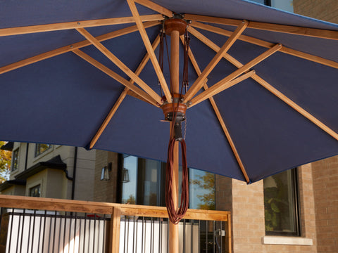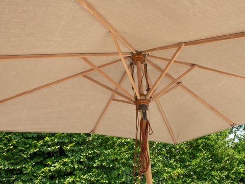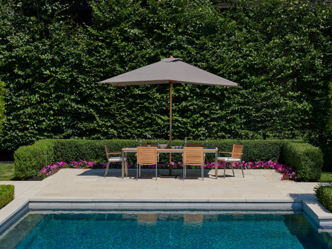 Add a splash of designer color while enjoying your outdoor living space in comfort with a deluxe patio umbrella from NewAge Products. The teak or stainless steel main post provides extra strong support for our large sized canopies, complemented by genuine teak ribs that keep the umbrella shape while adding classic style. Our umbrella canopies are stitched using the highest quality Sunproof material, an acrylic solution dyed fabric that provides over 97% UV protection, resists chlorine and is formulated to repel water, resist stains, mildew and fading for outstanding durability and long-lasting beauty. Opening and closing is smooth and easy, thanks to a convenient dual pulley system featuring premium stainless steel hardware and a durable nylon filament rope. Available in round, square or large rectangular sizes and a range of vibrant designer colors, NewAge umbrellas provide much needed shade so you can enjoy sunny days in perfect comfort.