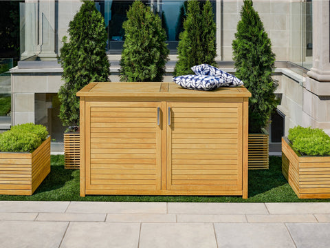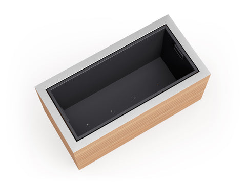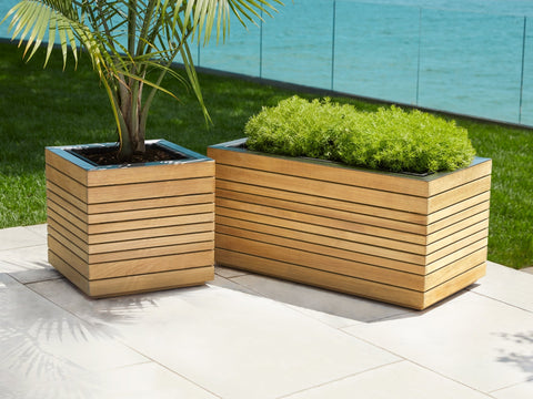 Dress up your backyard space with some natural greenery in eye-catching Rhodes Collection planters. Available in square or rectangular designs, the distinctive slatted design complements other collection pieces with an exterior case structure that’s crafted of premium natural teak for years of weather-resistant beauty. Top accent pieces in bright stainless steel or dusky powder coated aluminum add a further touch of contemporary style. The aluminum bin is both lightweight and corrosion resistant, ideal for wet outdoor conditions and easy to keep clean. Integrated hidden handles let you easily transport the interior bucket for planting or relocating. Decorative and versatile, our planters quickly convert to fashionable ice buckets. Simply line the insert bin with plastic, fill with ice and let the festivities begin.