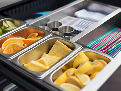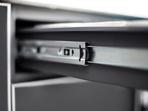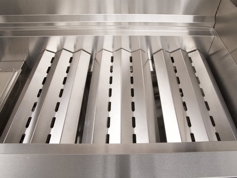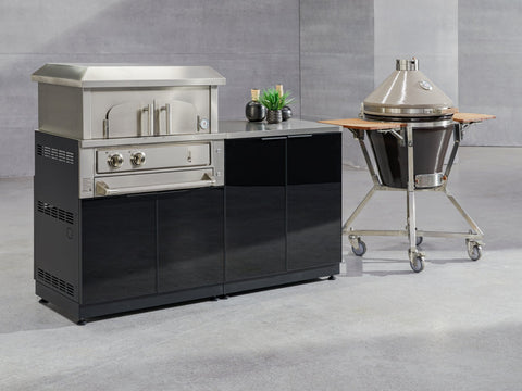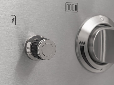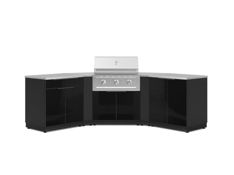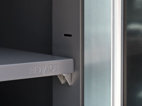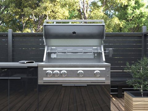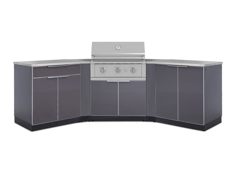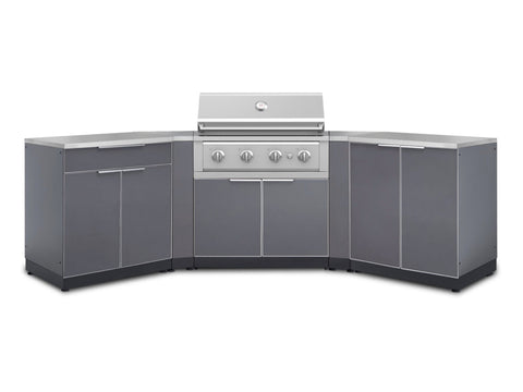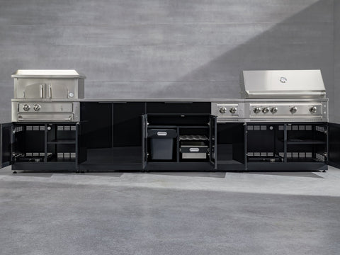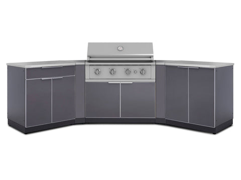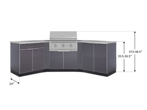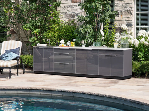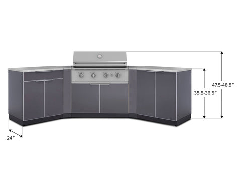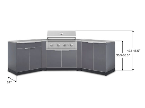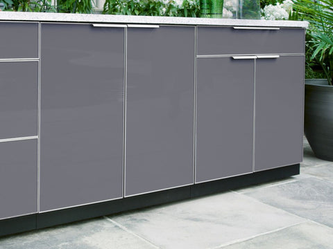 Add modern, functional storage to your exterior living space with Outdoor Kitchen cabinets in Aluminum. Constructed from aircraft-grade aluminum, these strong and durable cabinets offer plenty of weather-resistant storage to help you get organized. Tempered glass doors with integrated handles provide a modern, sleek style that complements any home, and the height-adjustable levelers keep your cabinets level on uneven decks and patio stones. The 45-Degree Cabinets can be used to build angles into your cabinet configuration, creating unique layouts and spaces, while adjustable shelves let you customize your 2-Door Cabinet to store items of any size. The Performance Grill Series features a full-length handle with a sturdy, dual-layered hood that locks in heat from the high-performance tube burners, delivering up to 48,000 BTUs. Enjoy generous cooking spaces of 507 sq. in. for the 33-inch grill, 562 sq. in. for the 36-inch grill, and 634 sq. in. for the 40-inch grill, all equipped with the features you need to grill with confidence and convenience. Continuous spark battery-powered pulse ignition gets things fired up quickly, while stainless steel flame tamers help reduce flare-ups, evenly distribute heat, and convert drippings to flavor-enhancing smoke. Seal in juices with the intense heat of a powerful infrared sear burner, and keep food warm and ready on the large elevated warming rack. The set is completed with an NSF Certified countertop for food safety, making clean-up a breeze. Stay organized and upgrade your backyard living space with NewAge Products Outdoor Kitchen cabinets in Aluminum.