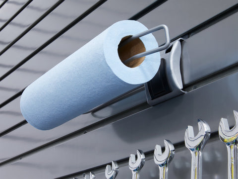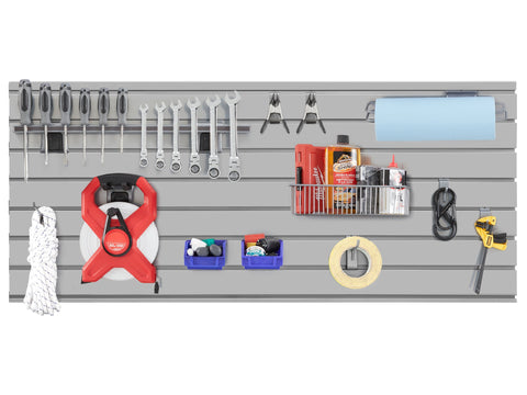 Make the most of your slatwall system, and keep your tools and equipment stored within easy reach, with the NewAge Products Steel Slatwall 12-Piece Accessory Kit. Designed for use with the NewAge Products Steel Slatwall Backsplash and Pro Series Steel Slatwall, and compatible with most 3 in. on-center slatwall systems, the wide variety of hooks and baskets will keep all of your garage items organized and easy to locate. Single Hooks of different lengths provide a place to keep your gardening tools or wrenches, while the Mini Basket keeps your cleaning supplies and spray bottles safely out of reach of kids. The Paper Towel Holder let’s you tear sheets one-handed for quick tidying, and the Magnetic Toolbar is a great place to store your often-used hand tools, with the magnetic strength to hold pliers, clamps and screw drivers. Built with steel for extra strength, and a powder-coat silver gloss finish that looks great in any space, the Steel Slatwall 12-Piece Accessory Kit helps to keep your garage efficiently organized.