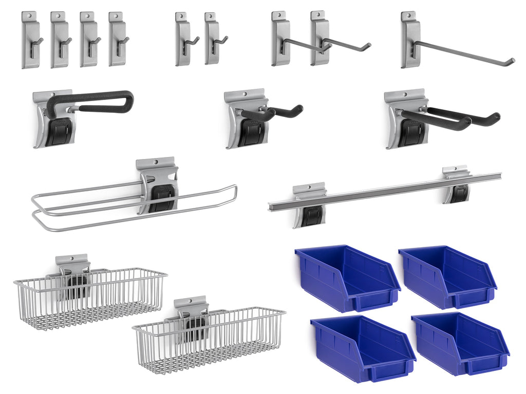 Create an organized and tidy garage space with accessible hooks and baskets designed for use on NewAge Products Steel Slatwall Backsplash and Pro Series Steel Slatwall, and compatible with most 3 in. on-center slatwall systems. The NewAge Products Steel Slatwall 20-Piece Accessory Kit includes an array of snap-in components for holding all of your outdoor gear, from hooks capable of storing heavy tools to Mini Baskets for storing all of your odds and ends. The Paper Towel Holder let’s you tear sheets one-handed for quick tidying, and the Magnetic Toolbar is a great place to store your often-used hand tools, with the magnetic strength to hold pliers, clamps, and screwdrivers. Built with steel for extra strength, and a powder-coat silver gloss finish that looks great in any space, the Steel Slatwall 20-Piece Accessory Kit helps to keep your garage efficiently organized.